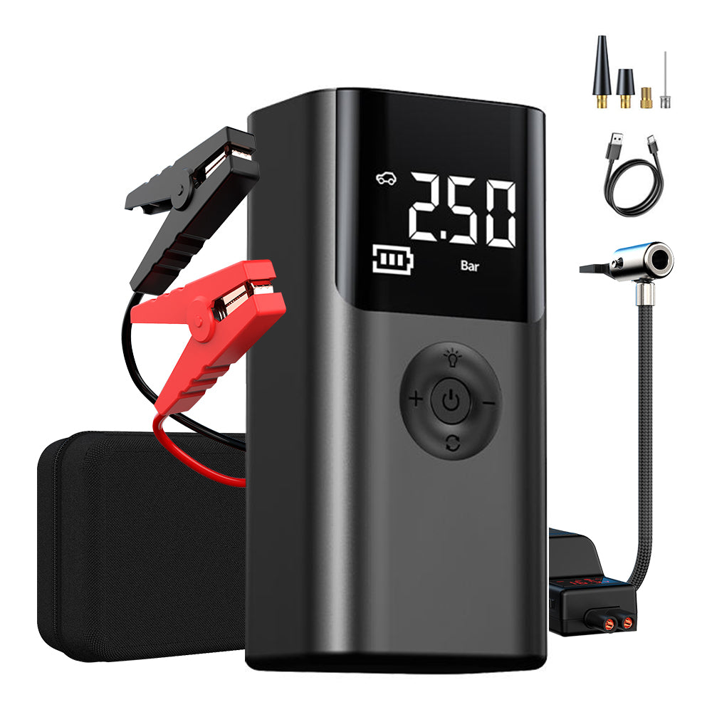 El Kit de Arranque de Coche 6 en 1 es un dispositivo multifuncional esencial para tu vehículo. Funciona como booster de batería, batería externa y démarreur de salto, además de incluir bomba de aire para neumáticos. Compacto, portátil y seguro, te brinda confianza en carretera y soluciones rápidas ante cualquier emergencia.